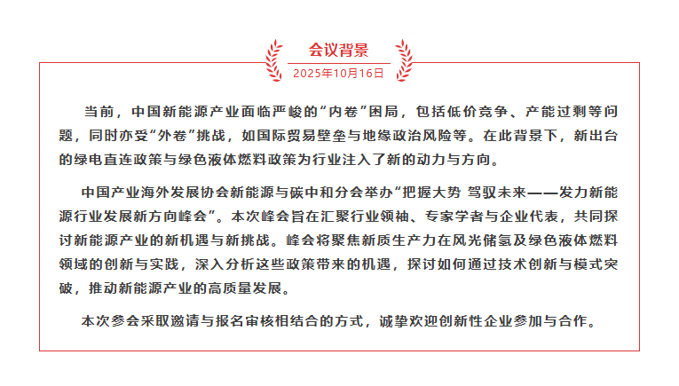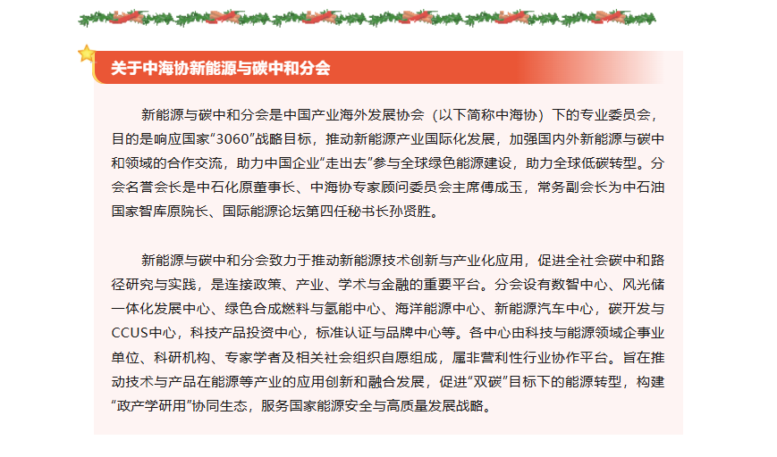 中海協(xié)新能源與碳中和分會作為中國產(chǎn)業(yè)海外發(fā)展協(xié)會旗下的專業(yè)委員會,是連接政策、產(chǎn)業(yè)、學術(shù)與金融的重要平臺。分會名譽會長由中石化原董事長、黨組書記傅成玉擔任,常務(wù)副會長由中石油經(jīng)濟技術(shù)研究院原院長、國際能源論壇第四任秘書長孫賢勝擔任,在新能源與碳中和領(lǐng)域具有重要影響力。本次峰會以“把握大勢 駕馭未來”為主題,將深入探討新能源產(chǎn)業(yè)發(fā)展的新趨勢、新機遇和新挑戰(zhàn)。會議將圍繞新能源技術(shù)創(chuàng)新、產(chǎn)業(yè)化應用、國際合作等關(guān)鍵議題展開討論,為推動新能源產(chǎn)業(yè)高質(zhì)量發(fā)展提供智力支持。